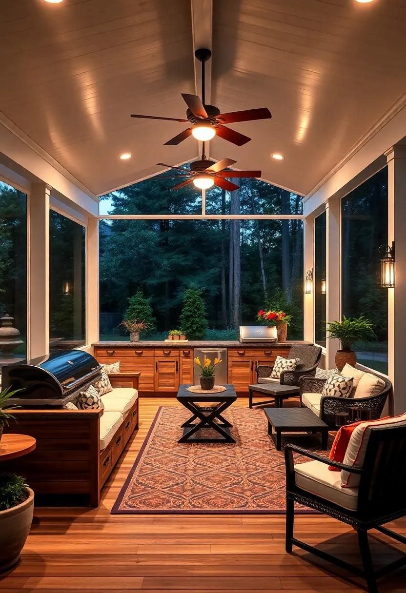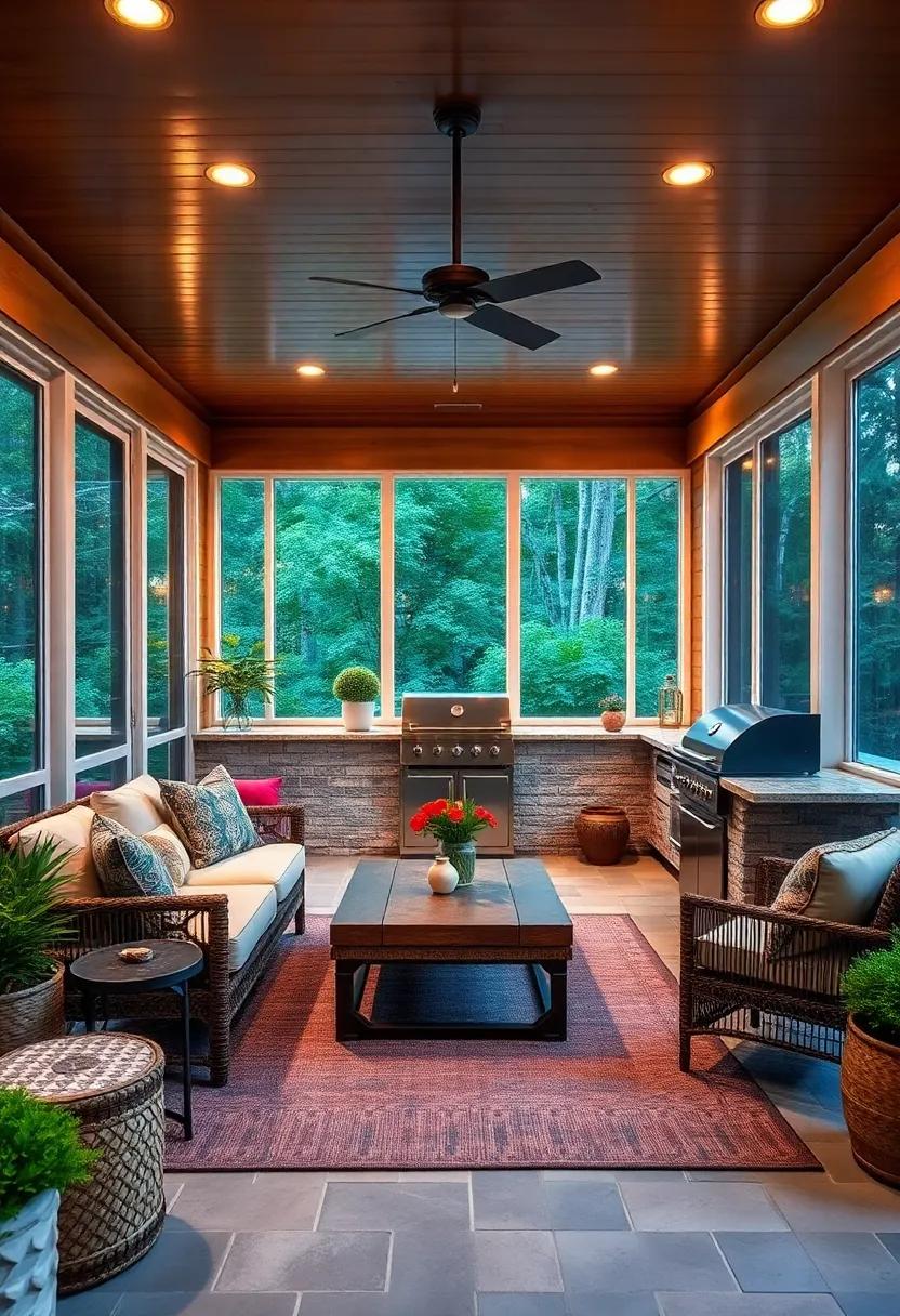 Cozy Retreat: A screened porch adorned with soft furnishings and an outdoor kitchen featuring a rustic grill, perfect for intimate gatherings under the stars