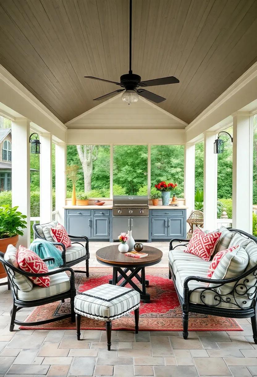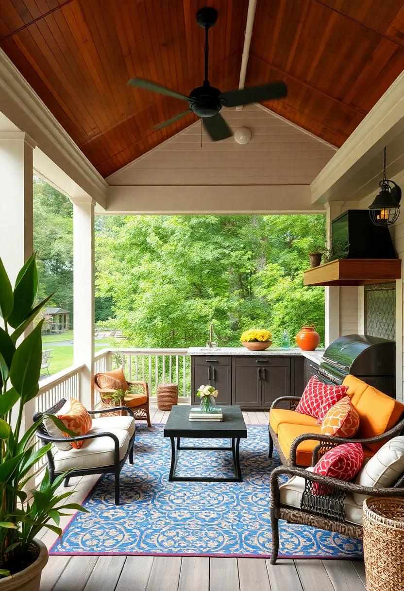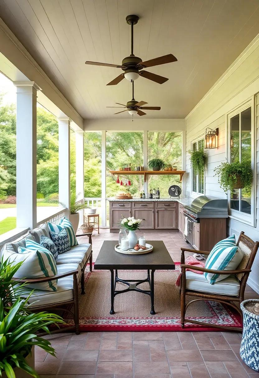 Vintage Picnic: This porch layout evokes a nostalgic picnic vibe, with comfortable seating and a quaint outdoor kitchen perfect for homemade delights