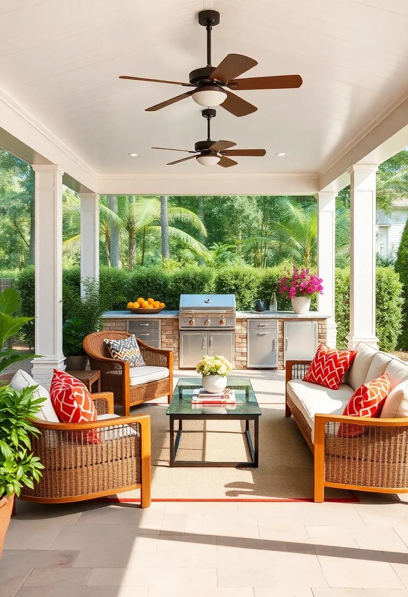Tropical Oasis: Bright colors and lush greenery surround a vibrant outdoor kitchen, making this porch feel like a vacation destination year-round