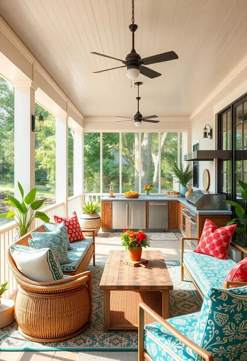 Eclectic Mix: A vibrant assortment of colors, textures, and an outdoor kitchen filled with character bring a bold personality to this screened porch