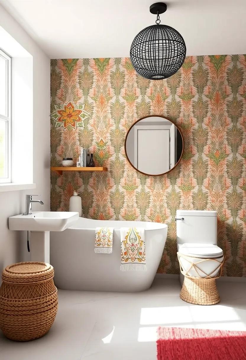 For those who dare to break the mold, removable wallpaper offers a unique and stunning way to infuse your bathroom with a splash of personality. Choose a striking pattern—be it bold florals, geometric shapes, or abstract designs—to transform blank walls into visual masterpieces.This temporary solution allows you to experiment without the commitment of traditional wallpaper, making it easy to change your decor on a whim. Pair your vibrant wallpaper with natural boho elements like rattan accents and wooden accessories to maintain a cohesive, earthy feel while the colors pop.