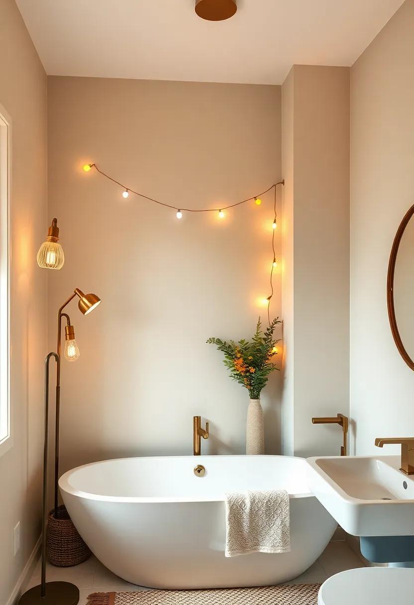 Layered Lighting: Combine floor lamps and string lights in a variety of colors to create a warm, inviting glow in your bohemian bathroom
