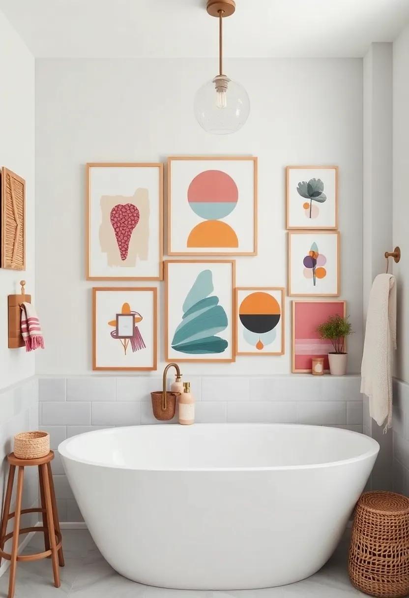 Eclectic Artwork Collage: Create a gallery wall featuring mixed media,colors,and styles to personalize your bathroom with bursts of creativity