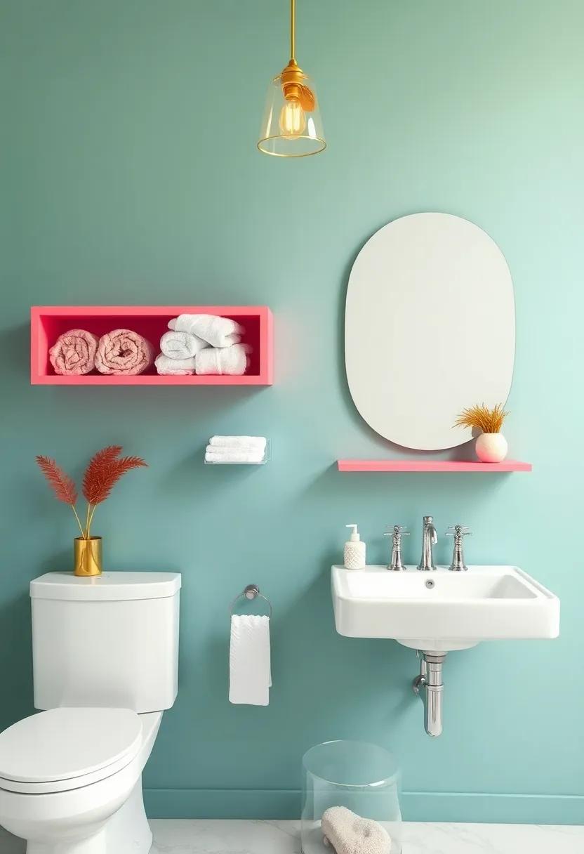 Accent Shelves: Use shelves painted in lively colors to display rolled towels or decorative items for a clever mix of functionality and aesthetics