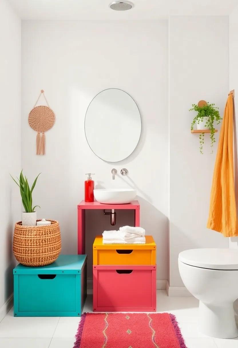 Funky Storage Solutions: use colorful boxes or bins for organization that also serve as artistic displays in your bathroom space