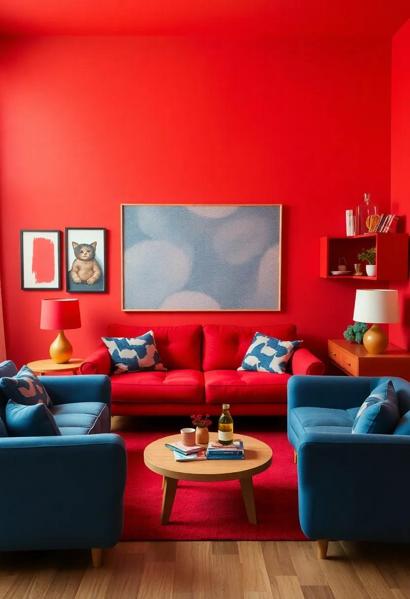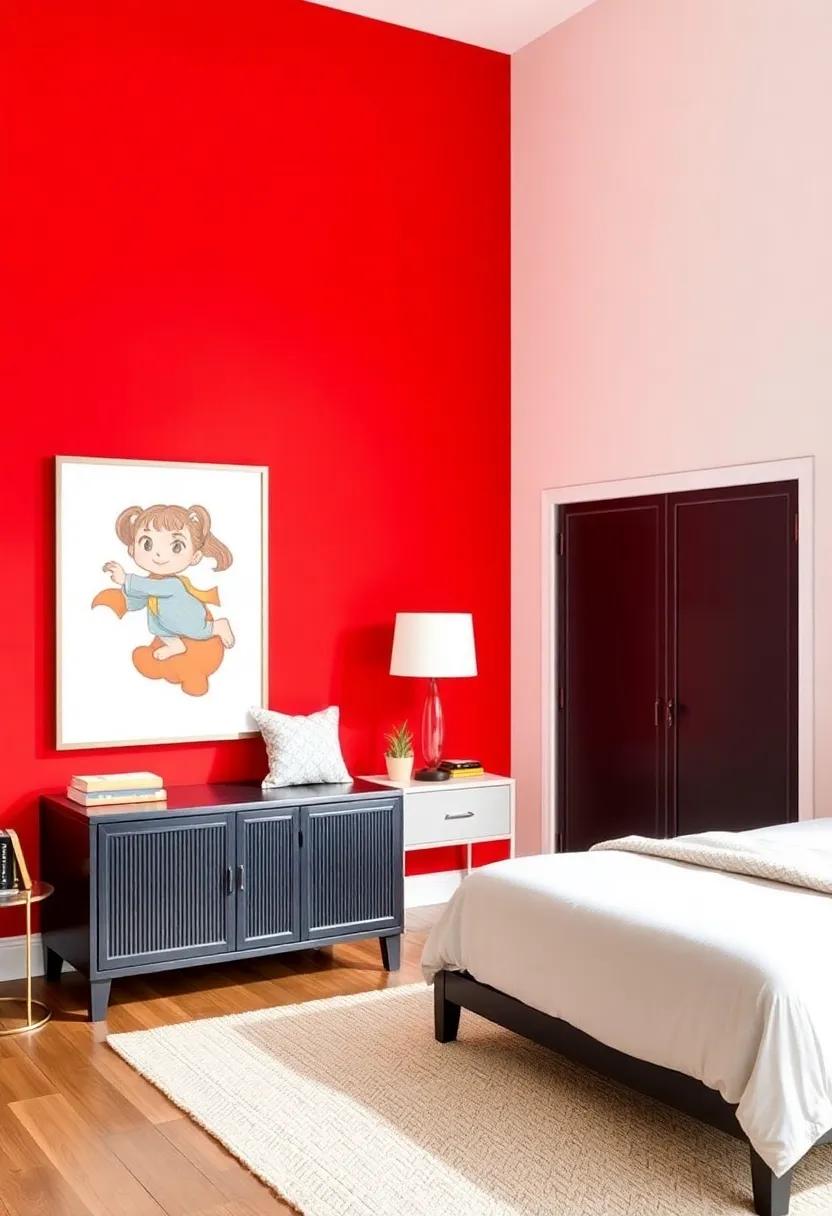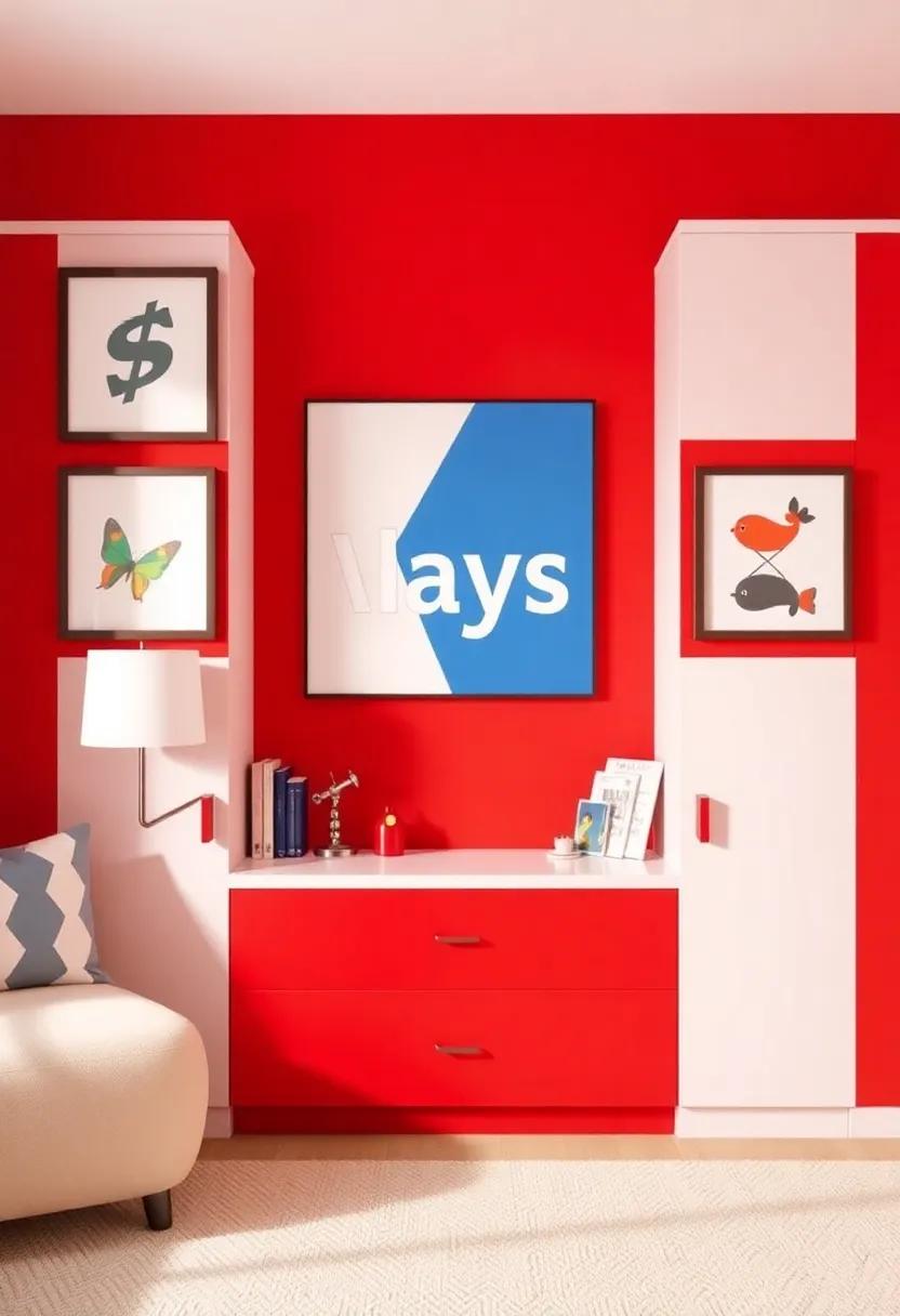 Start with a Statement Wall: choose a vibrant red shade for one wall to serve as a dynamic backdrop, creating a focal point in the room that energizes the space