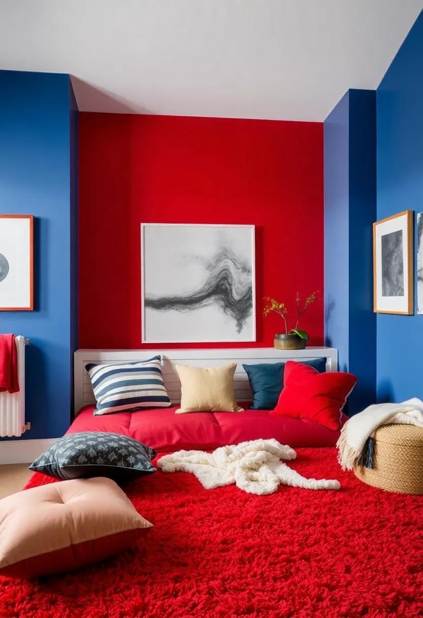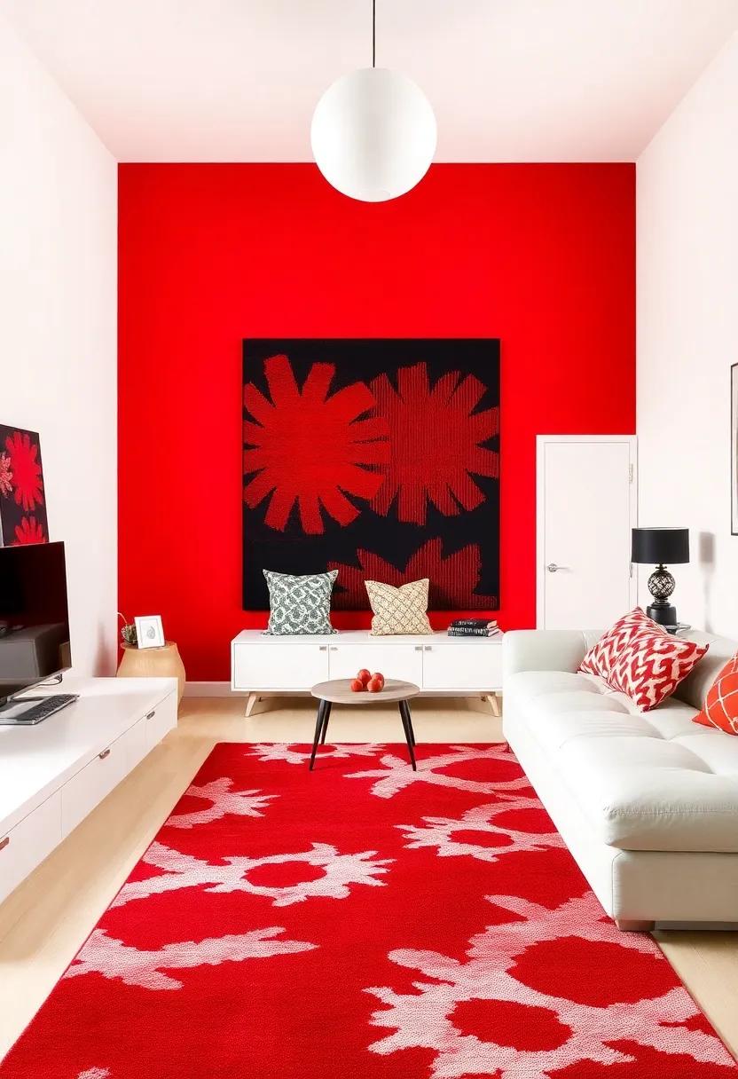 Choose Bold Rugs: Opt for a large area rug with striking red patterns or designs to anchor the space and create a playful atmosphere underfoot