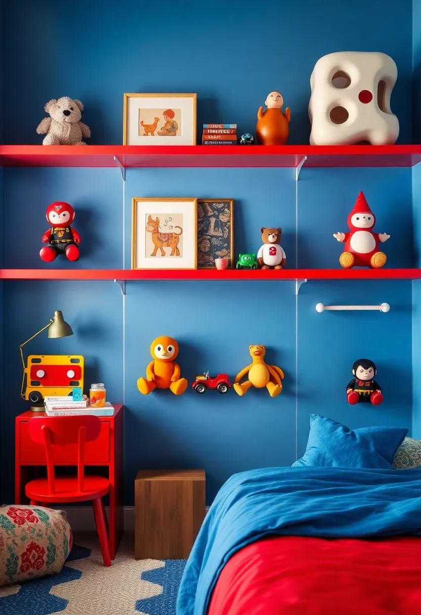 Curate a Toy Display: Use open red shelving to proudly showcase your child’s favorite toys and collections, making them part of the room’s decor