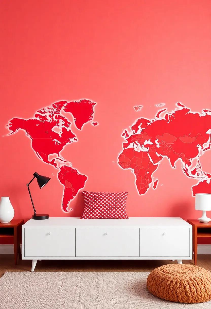 Design a Map Wall: Paint a world map in red tones for an educational twist that invites exploration and sparks curiosity about different cultures and places