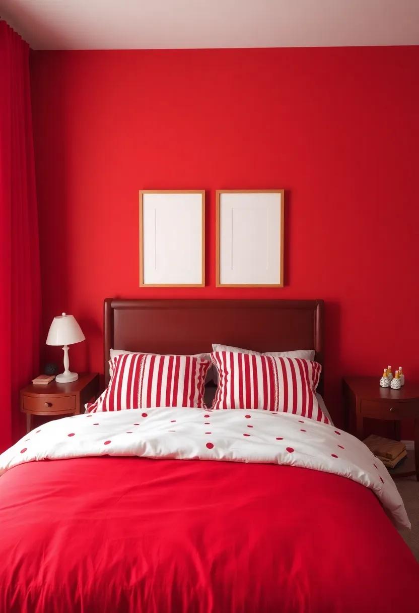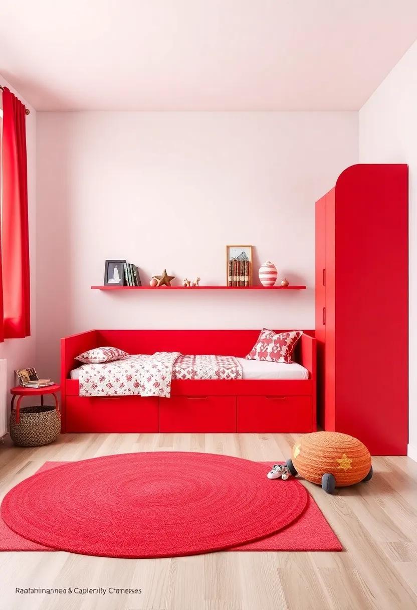 Incorporate Fun Patterns: Use playful patterns in red, like stripes or polka dots, on bedding or curtains to add depth and visual interest while maintaining the bold theme