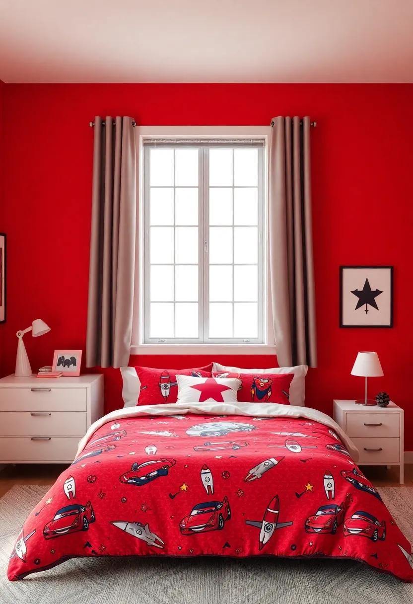 Use an Action-packed Bedspread: Opt for a bedspread featuring superheroes, cars, or rockets in red to ignite your child’s imagination as they dream of adventures