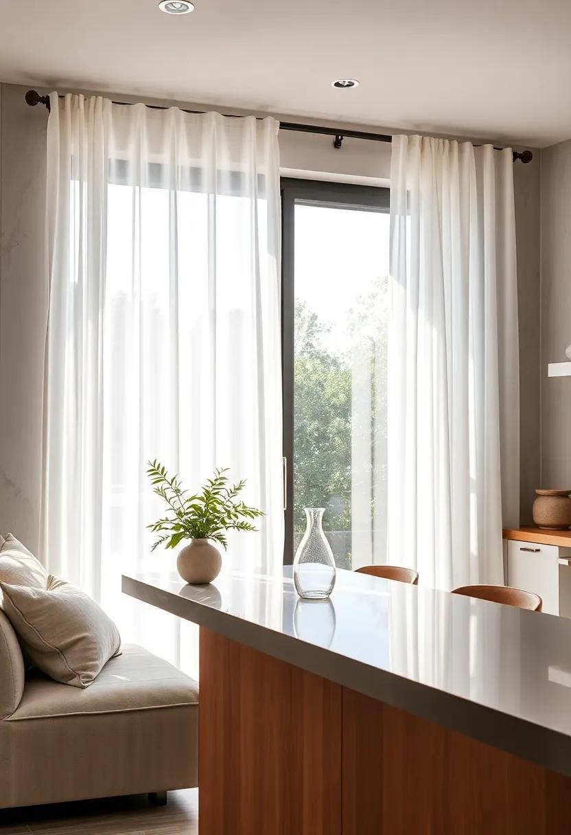 Sheer Elegance: Delicate white sheer curtains that gently filter sunlight, creating a bright and airy atmosphere while maintaining privacy