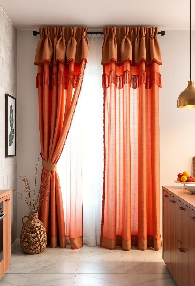 Textured Layers: Curtains with varied textures,from ruffles to fringes,that add tactile interest and depth to your kitchen decor