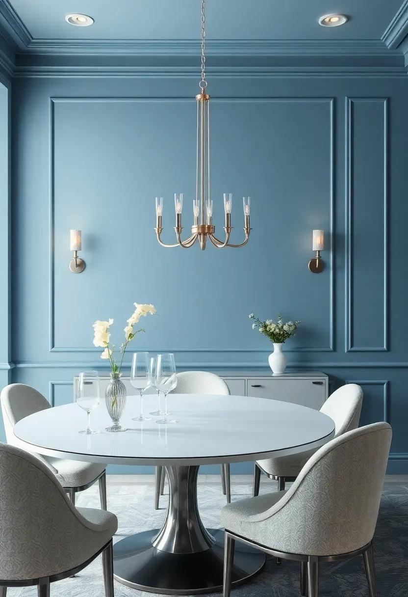 Transform your dining space into an⁢ oasis of tranquility by ⁤blending frosty blue hues with eye-catching⁢ silver accents.Imagine light⁤ blue walls that evoke the serene calmness⁢ of ⁤a ​winter sky. Complement these with ‌silver-toned ‌furniture or‍ decor elements​ that glimmer​ subtly in the light. A ‌shimmering silver chandelier can serve​ as a stunning ⁣focal ⁢point, while luxuriously⁣ upholstered chairs in icy ⁣blue fabrics add both ⁤comfort and style. To ​further enhance⁤ this palette,⁤ consider incorporating an area ⁤rug⁣ adorned with cool hues, bringing ‍together the⁤ room’s aesthetic seamlessly.