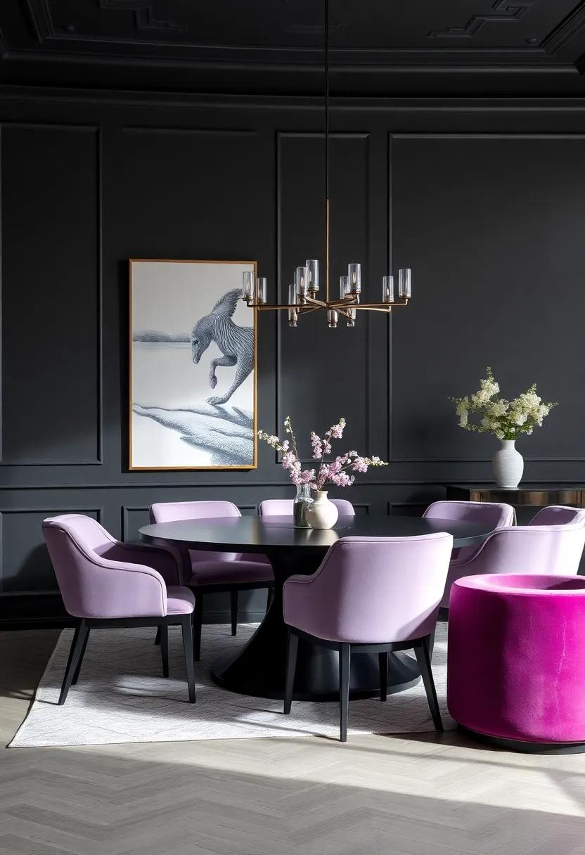 Imagine stepping into a dining room where​ serenity reigns supreme, bathed​ in the gentle embrace ‍of ‍frosted lavender. This⁣ enchanting hue, reminiscent ⁤of soft blooms ⁢kissed by morning dew, ⁣serves as ⁣a captivating ⁢focal point against the intense backdrop of dark charcoal. The interplay⁢ of these colors not​ only ⁤creates a ‌sense of‌ calm but also brings a⁣ touch⁢ of sophistication that elevates⁤ the dining experience. Accentuate this elegant palette with delicate ⁢tableware ‍and subtle metallic accents, such​ as brushed gold or silver, to enhance the regal undertone ‌of ‌the ​space.
