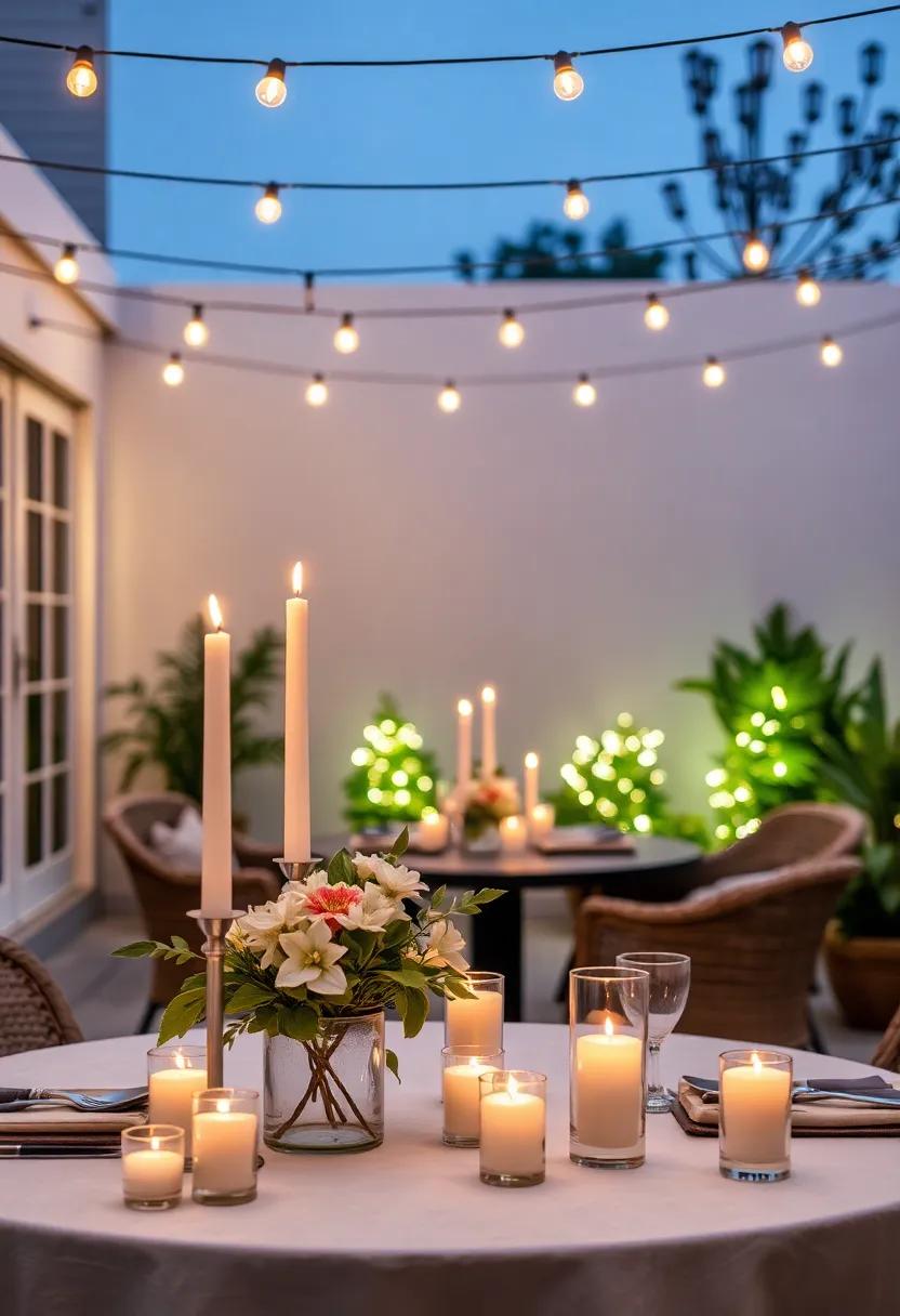 Candlelit Dinner: Create an intimate dining experience using clusters of candles in varying heights, offering soft lighting paired with romantic atmosphere