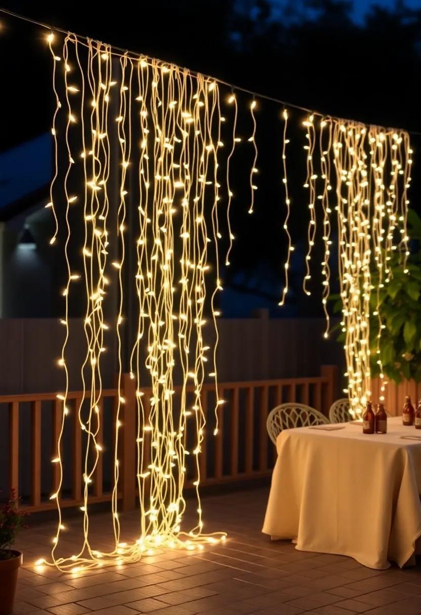 Cascading Fairy Light Curtains: Install a curtain of fairy lights dripping down for a stunning backdrop, perfect for special occasions or intimate dinners