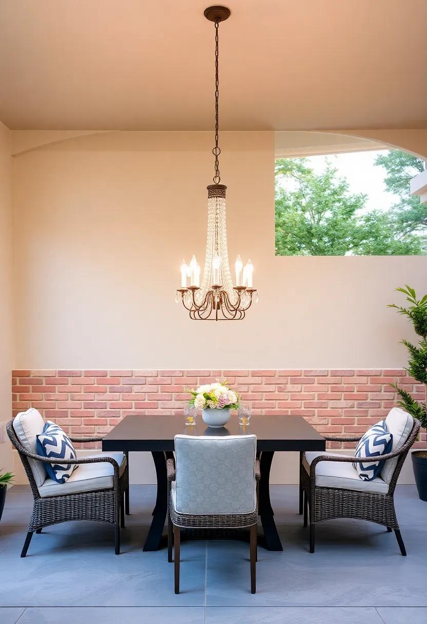 Chandelier magic: Imitate indoor elegance by adding a chandelier to your outdoor dining space, creating an unexpected focal point that exudes sophistication