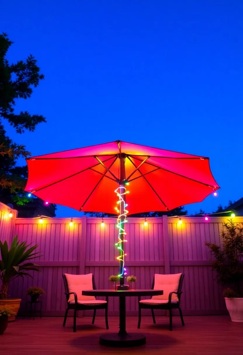 Colorful Umbrella Lights: Transform a mundane patio umbrella into a vibrant centerpiece with colorful lights that create a festive atmosphere, perfect for summer nights