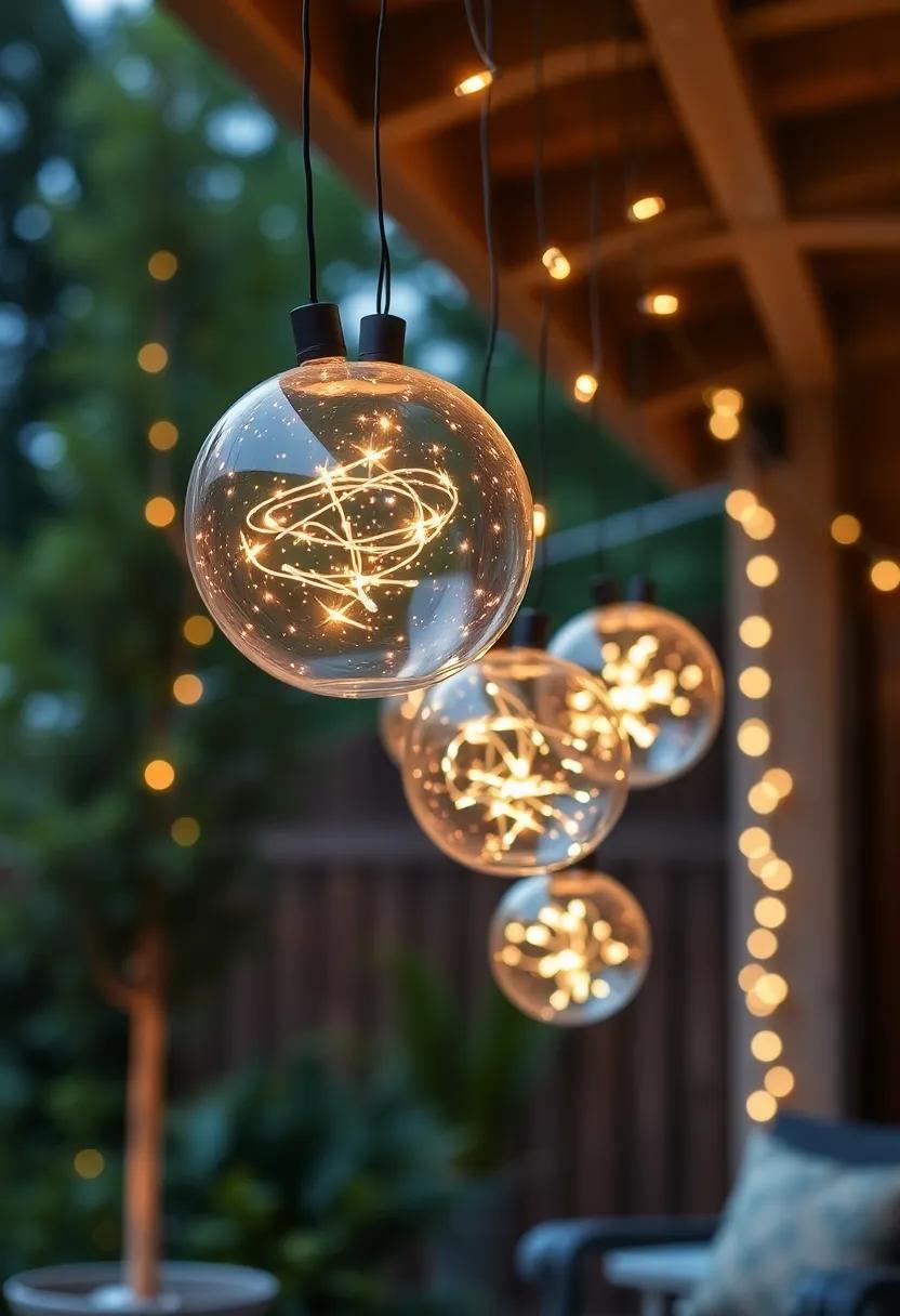 Hanging Glass Orbs: Suspend glass orbs filled with string lights to create a mesmerizing effect that dances with the gentle night breeze, captivating all who gaze upon them