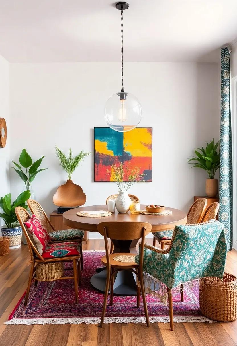 Bring the room alive by incorporating a variety of patterns and colors through accents such as a bold centerpiece or a collection of colorful dinnerware. Use a mix of vintage ceramic plates, woven placemats, and patterned fabric napkins to create a dynamic tablescape that reflects your unique style. Small elements like succulents in terracotta pots, funky candlesticks, and layered textiles add layers of texture that enhance the room’s character.This harmonious blend of eclectic design elements will undoubtedly transport your dining space into a free-spirited sanctuary.