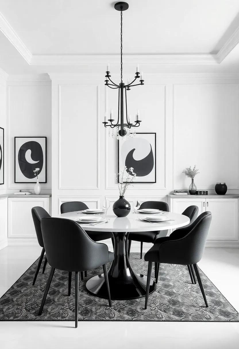 Embrace the allure of a monochrome palette to redefine your dining area with an air of sophistication. Black and white, the ultimate power couple in color schemes, offers an effortless way to create a chic atmosphere. Consider bold black dining chairs juxtaposed against a pristine white table, or vice versa, to create a striking visual contrast. Incorporate elegant décor elements like framed black-and-white art or a sleek chandelier to elevate the space, making it ideal for both intimate dinners and lively gatherings. Textiles in varied textures, such as a soft white tablecloth paired with velvet black napkins, can further enhance the tactile experience, setting the stage for memorable feasts.