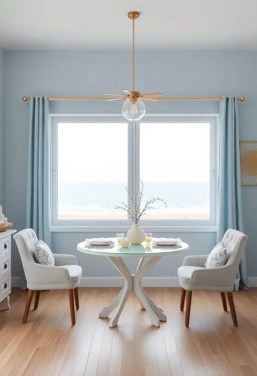 Coastal Retreat: Bring the beach to your dining area with a palette of soft blues, sandy beiges, and decor featuring seashells and driftwood for a calming seaside vibe