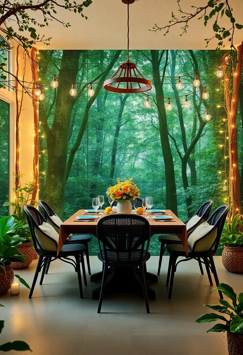 Transform your dining area into an enchanting forest retreat by incorporating rich greens that mirror the lush foliage of a serene woodland. Start with a backdrop of green walls or rich-hued table linens that evoke the essence of nature. Layer in textures with mossy table runners or placemats made from jute to add depth and warmth. Complement these natural elements with an array of small potted plants or hanging terrariums that bring a breath of fresh air indoors. Incorporate rustic wooden tableware to enhance the organic feel and create a seamless link between your dining experience and the tranquility of the outdoors.