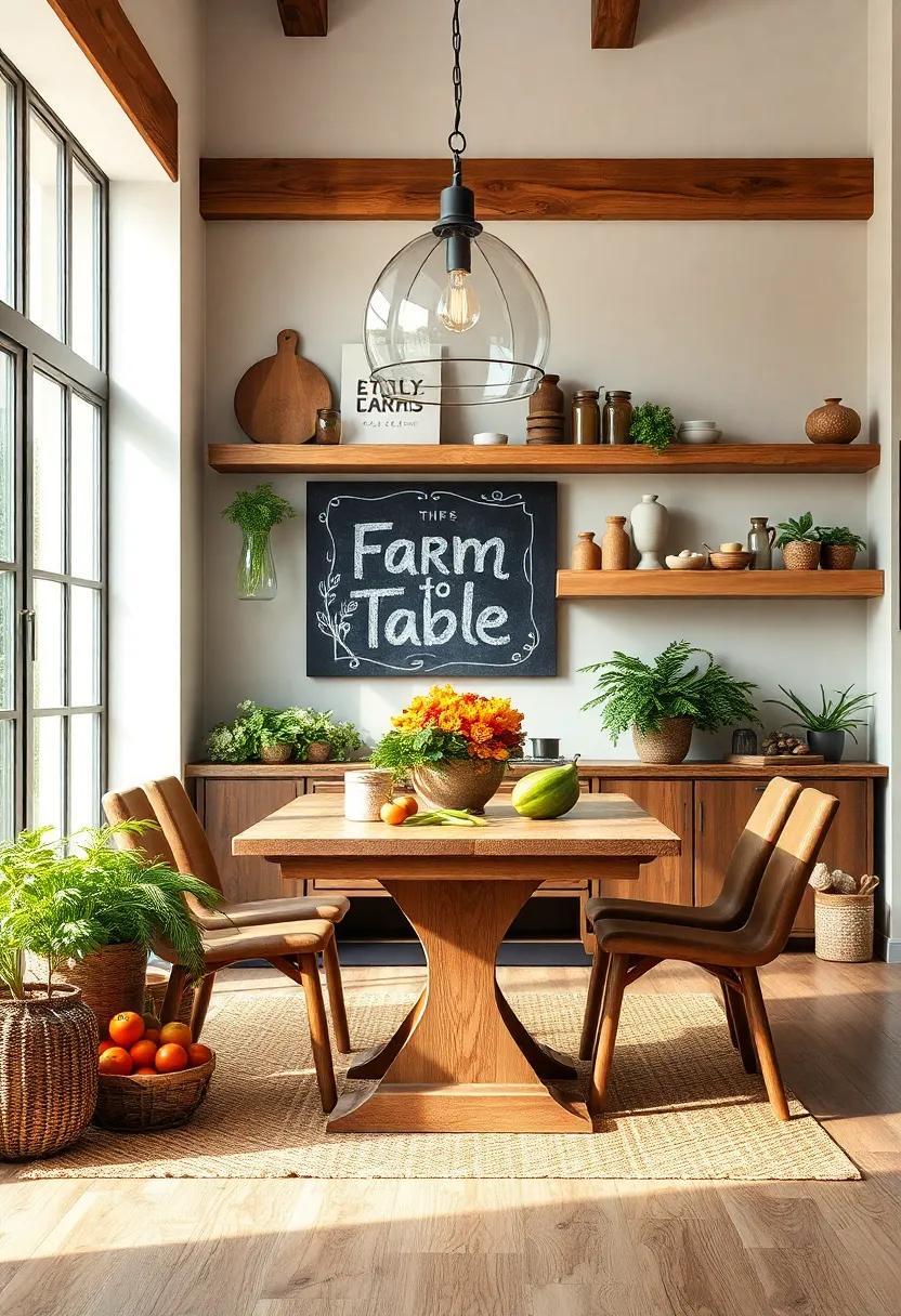 Add a personal touch with chalkboard art that pays homage to seasonal ingredients or your favorite recipes.Larger boards can serve as dynamic menus that change with the seasons or highlight local farms you support. in contrast, smaller chalkboards can be used for playful quotes or daily specials. Combining these elements will not only provide an aesthetic appeal but will also instill a sense of community bonding over shared meals. To bring it all together, consider a rustic dining table made from reclaimed wood, surrounded by mismatched chairs that echo a sense of casual outdoor dining, making each meal feel like a party of nature.