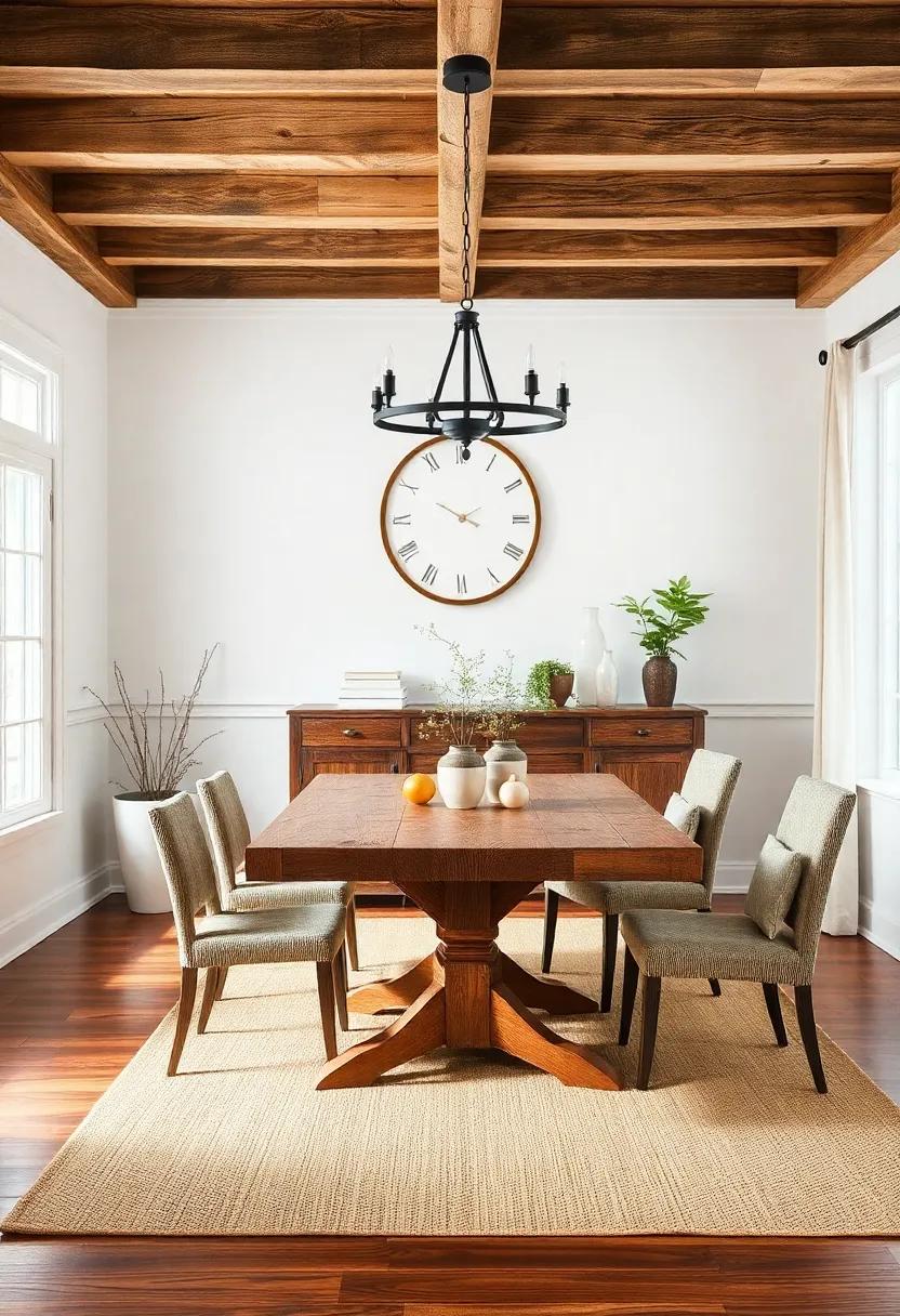 Transform your dining room into a cozy retreat with the warmth of natural wood elements and vintage décor. Start by incorporating exposed beams and reclaimed wood tables that add character and authenticity to the space. Mixing different wood tones can elevate the rustic feel, while a large farmhouse table serves as the perfect centerpiece for family gatherings. don’t forget to add woven baskets and wooden stools to soften the look and bring in additional texture. To complete the ambiance, layer your lighting with rustic fixtures: think antique lanterns or chandeliers with a weathered finish for that inviting glow.