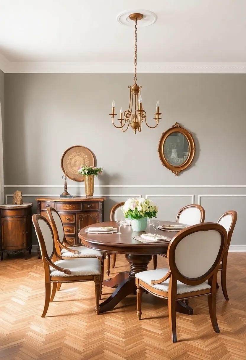 Vintage Elegance: Curate an array of antique furnishings and ornate accents that tell a story, creating a dining space filled with character and nostalgic charm