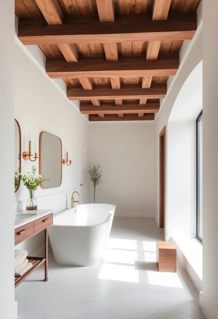 Exposed ⁤Beams Pair‌ with⁤ a freestanding tub‍ for a spa-like vibe
