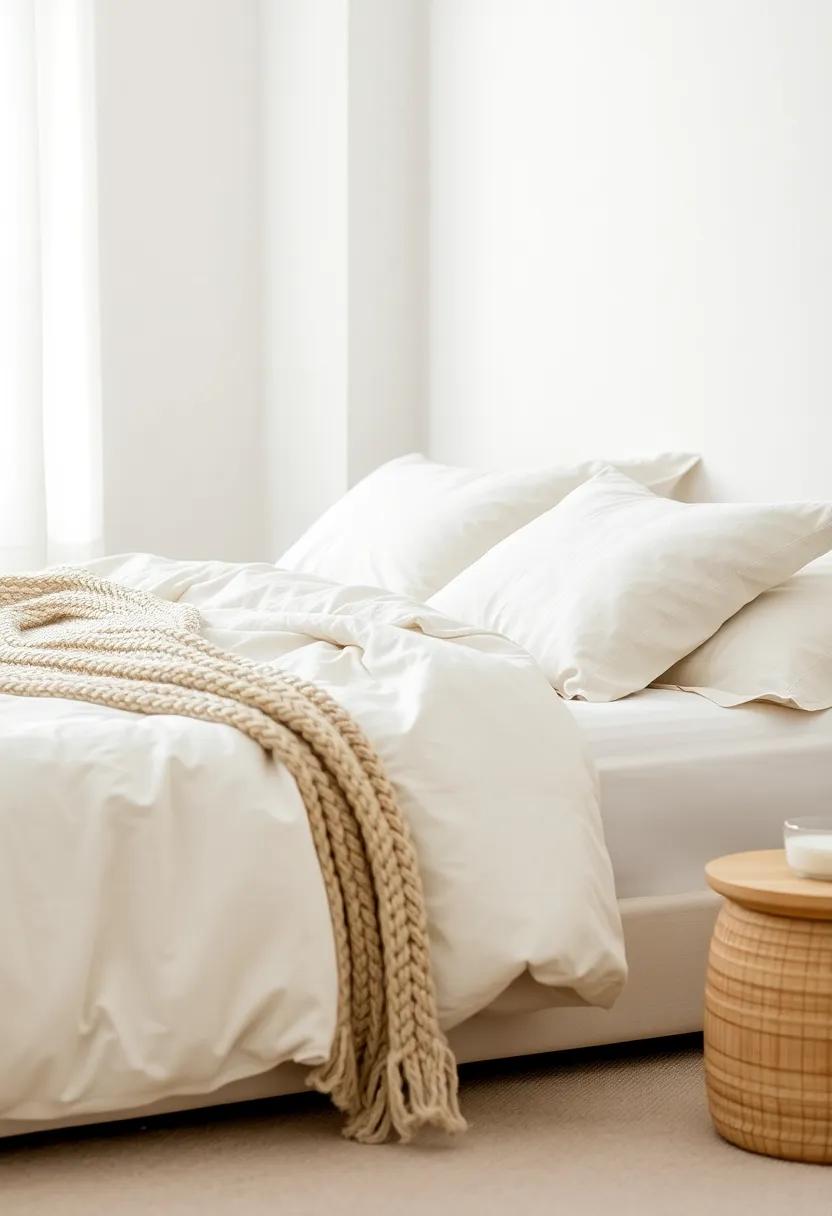 Discover the charm of layered textures, where a subtle knitted throw adds warmth to cotton sheets in a creamy palette