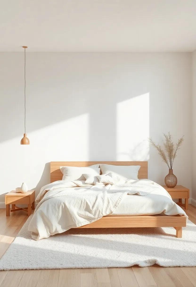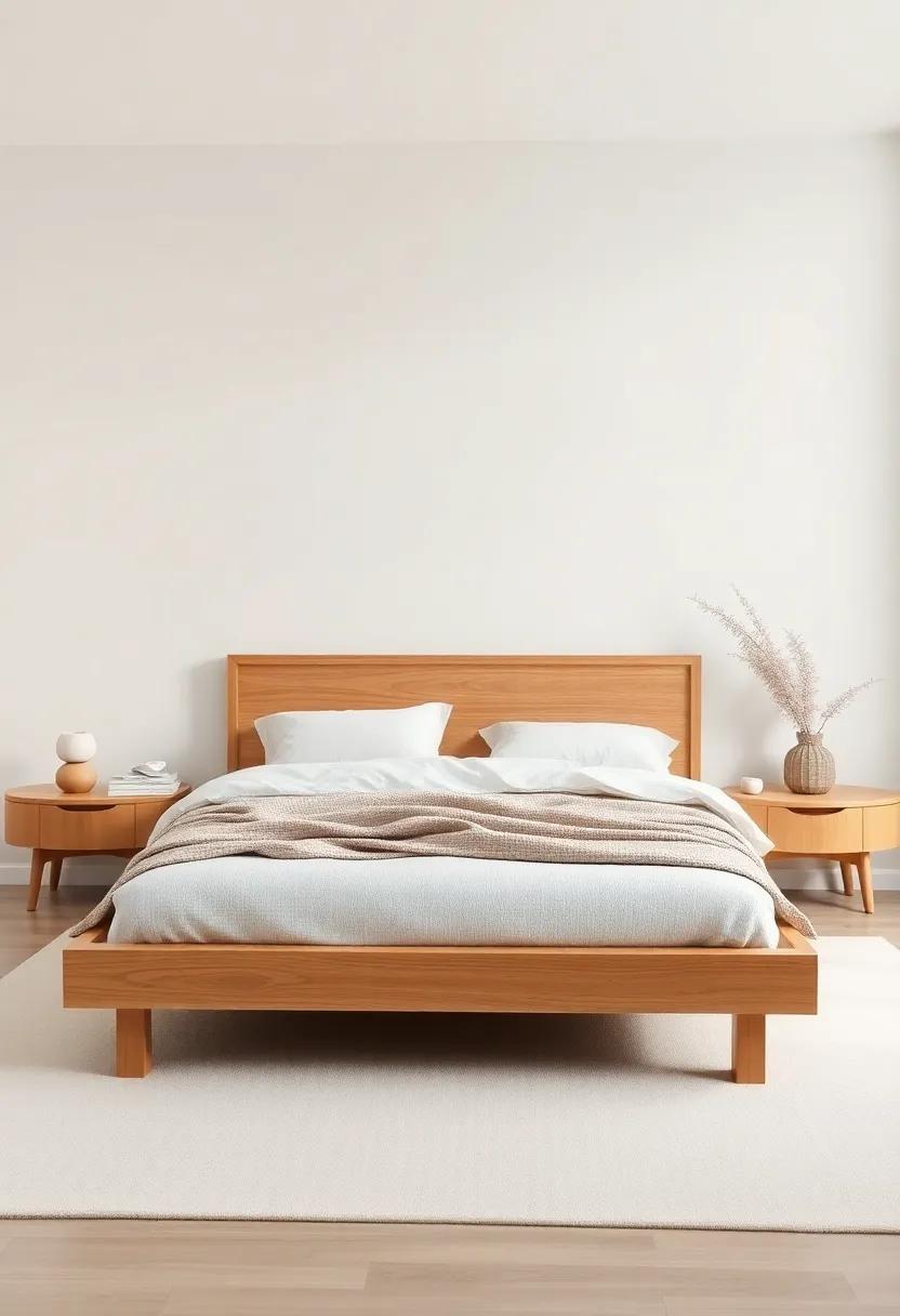 A sleek modern bed frame in natural wood and neutral bedding creates an understated elegance that promotes serenity