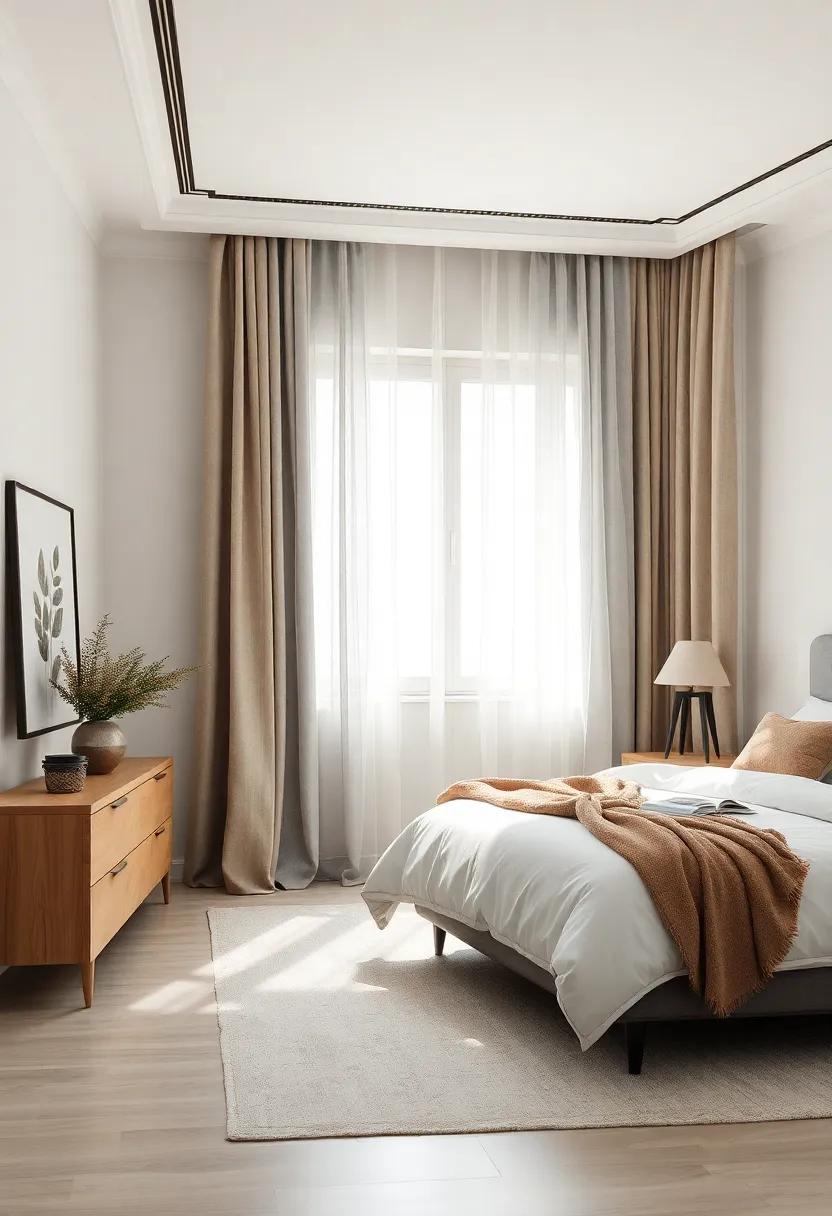 Soft gray tones blended with earthy browns offer a grounding effect, while delicate sheer​ curtains allow gentle light to filter in