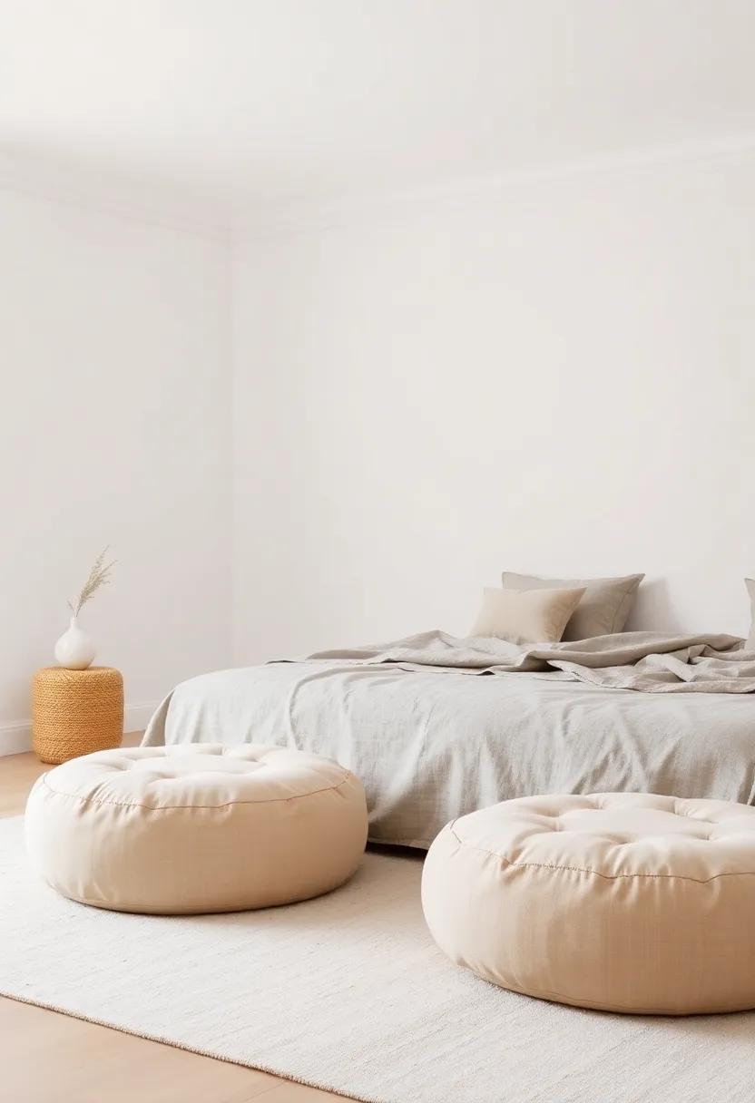 Soft ottomans or poufs in neutral tones provide additional seating and comfort without detracting from the serene focus of the room