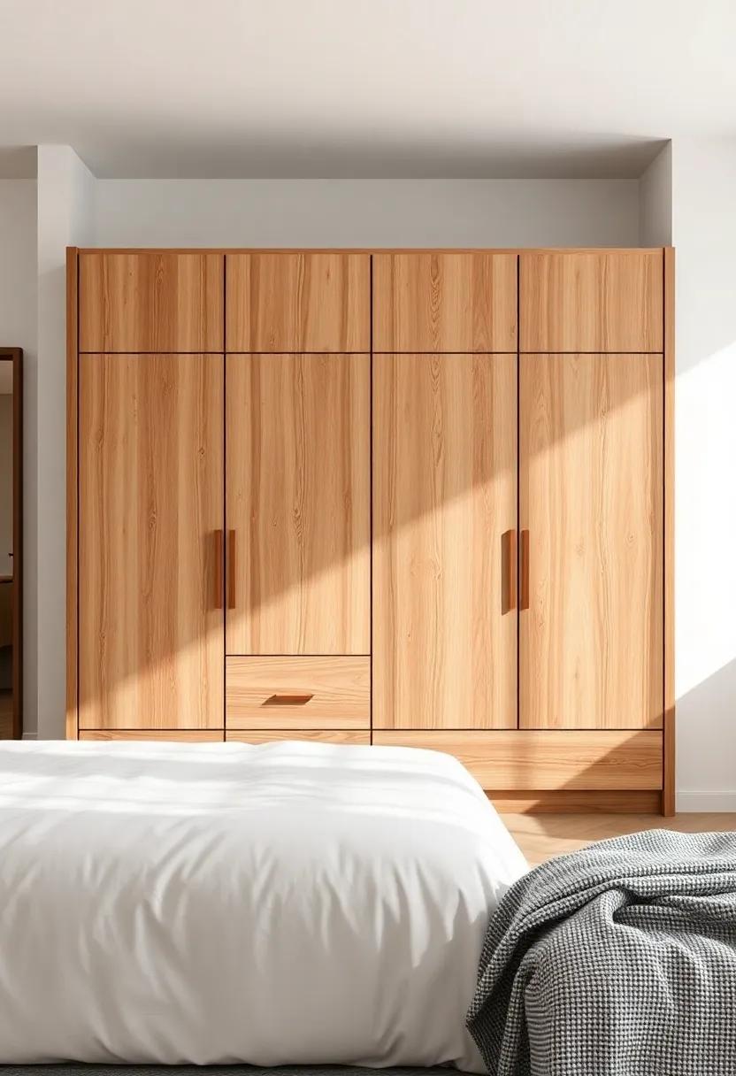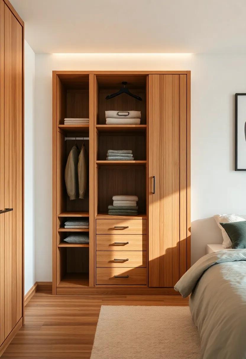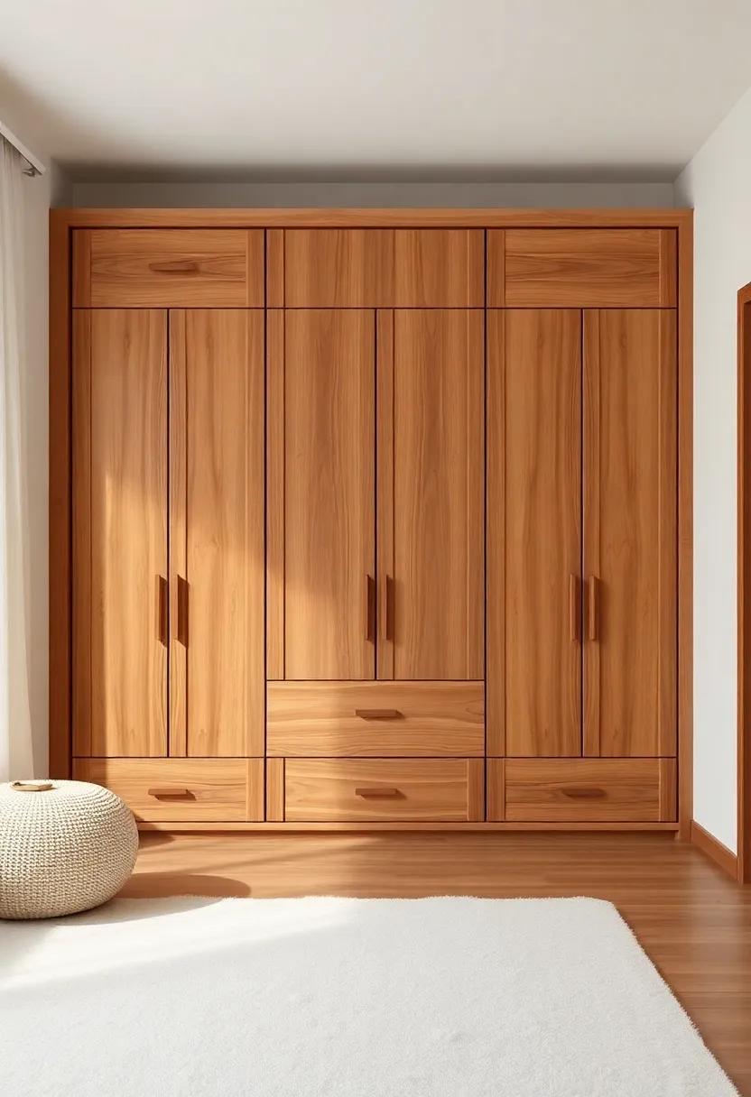 Minimalist Marvel: A sleek,modern wardrobe with clean lines and a natural wood finish that seamlessly blends with any bedroom decor