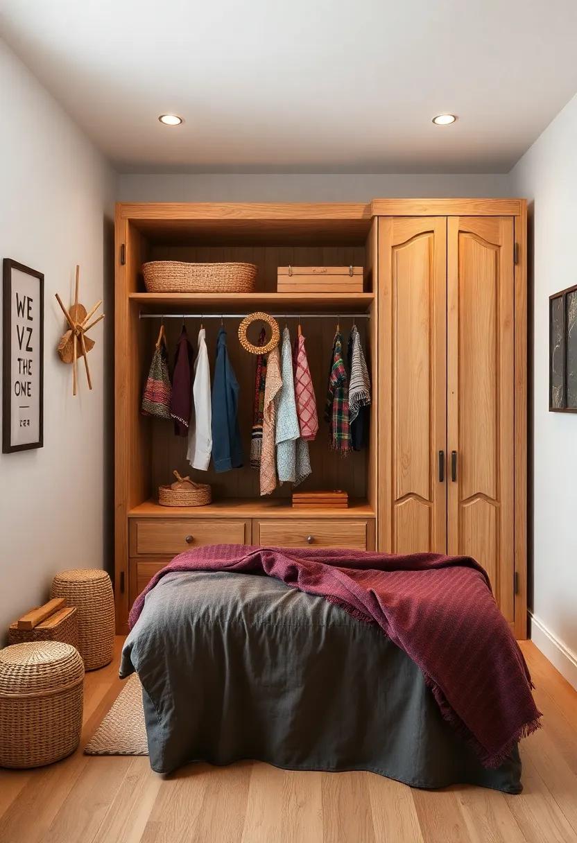 To enhance the bohemian vibe, consider incorporating elements that evoke wanderlust and artistic expression. A wardrobe like this can be complemented with accessories such as colorful scarves, woven baskets, and fabrics from around the world. Imagine adding a touch of whimsy with curated items that contrast against the natural wood — think of handmade dreamcatchers, potted succulents, or woven macramé hangers draping effortlessly from the wardrobe’s spacious interior. Whether it’s the casual charm of slightly distressed finishes or the allure of vibrant, embroidered textiles spilling from open doors, this wardrobe will undoubtedly be a centerpiece that inspires creativity and invites a sense of playful living.