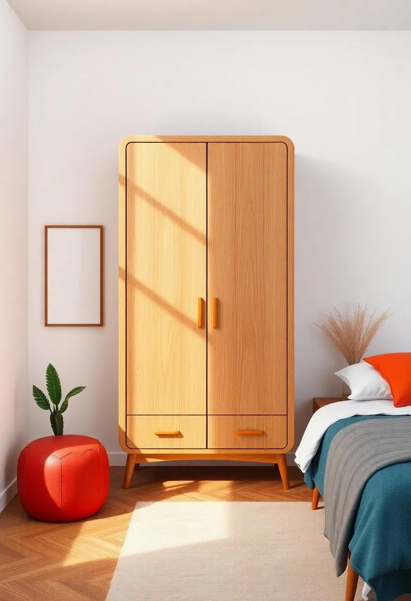 Mid-Century Modern: Reflect the style of the 1960s with a wooden wardrobe featuring tapered legs, bold colors, and geometric detailing