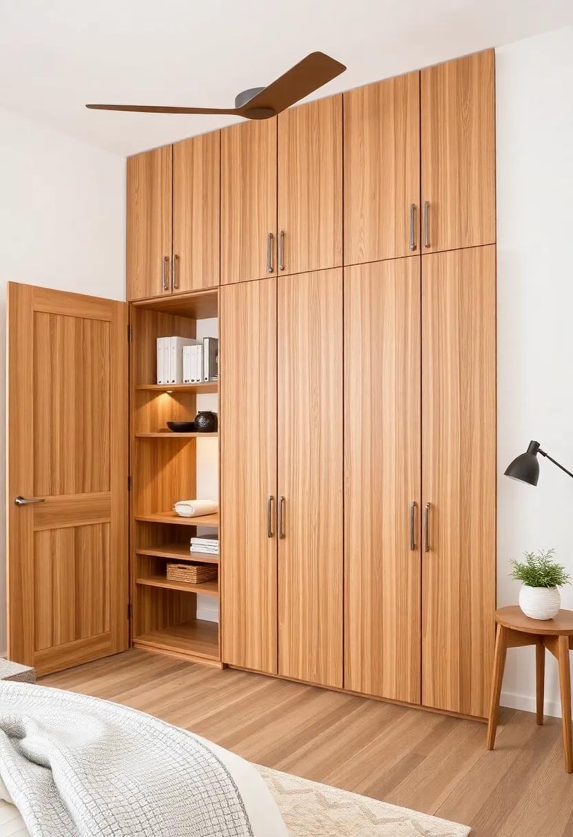 Imagine stepping into a bedroom where style meets functionality through an exquisite blend of open shelving and traditional wooden doors. This design element not only allows for easy access to your favorite items but also creates an prospect to showcase your decor in a visually appealing manner.Open shelving presents a stunning display area for books, plants, or decorative boxes, elevating the overall aesthetic of the space while maintaining a sleek and uncluttered environment. Pairing it with wooden doors can lend a rustic touch, adding warmth and texture to your room.
