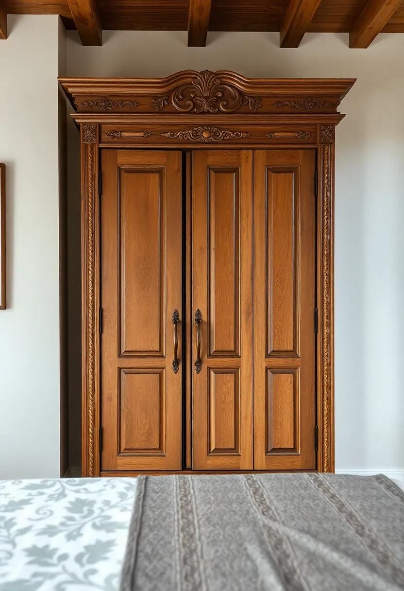 Rustic Chic: Embrace a charming farmhouse vibe with a weathered wood wardrobe adorned with intricate carvings and vintage handles