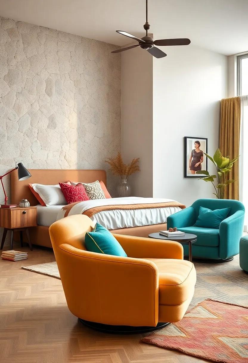 Swivel chairs from the 60s and 70s are not just furniture; they are a statement of personality and style. These iconic pieces, often adorned with bold prints and vibrant colors, bring a touch of the playful essence of the past into your modern space. Perfect for lounging, they invite both relaxation and conversation, making them a versatile addition to any bedroom setting. Imagine sinking into a plush cushion, the chair effortlessly spinning to allow you to take in every corner of your room or chat easily with friends. Whether you choose a retro egg chair or a funky barrel design, these timeless pieces are sure to spark joy.