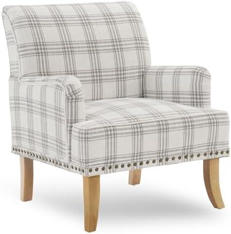 Designed for both elegance and comfort, this accent chair features high-quality linen fabric that not only enhances its aesthetic appeal but also guarantees durability. The classic plaid pattern, combined with meticulous nailhead trim, adds a touch of sophistication to your home decor. With solid wooden legs providing exceptional stability, it can support up to 300 lbs, making it a sturdy choice for any space. Measuring a generous seat width of 28.75 inches and a depth of 20.75 inches, it offers ample room for relaxation, whether you’re reading a book or enjoying a chat with friends.