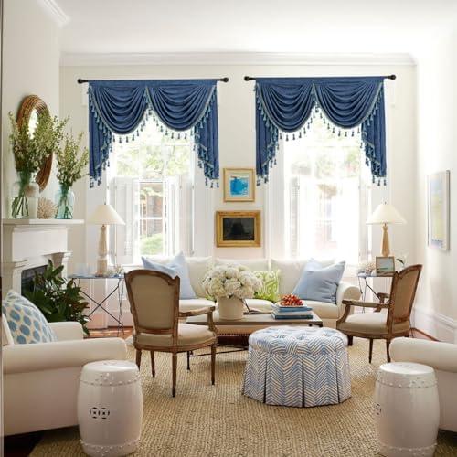 These exquisite window treatments are crafted from high-quality imported heavy chenille, providing a touch of elegance to any room. The luxurious fabric drapes beautifully with a sleek waterfall design, complemented by stylish tassels that enhance its visual appeal. Available in multiple colors, including navy, these valances are perfect for adding a pop of color to your living room, bedroom, or kitchen. The 2.8-inch rod pocket allows for easy installation, accommodating standard curtain rods with a cascade length of 43 to 46 inches, ensuring a perfect fit for various window sizes.