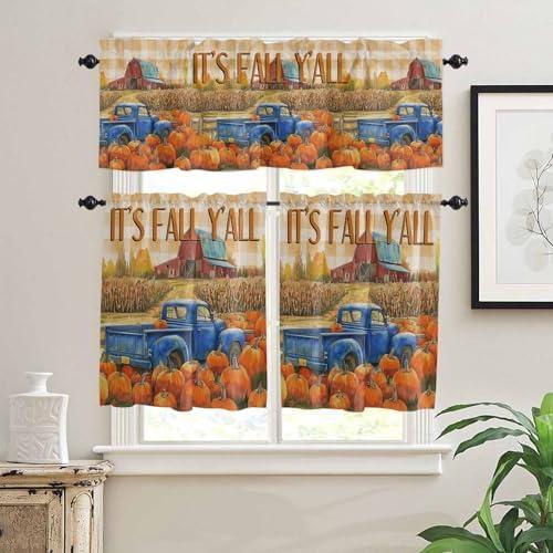 Elevate your home decor with this charming tier drapes and valance set, meticulously designed to add a cozy autumn touch to any room. The unique print combines elements of vibrant orange pumpkins and a classic blue truck, making it an eye-catching choice for kitchens, bedrooms, or bathrooms. Made from durable polyester fabric, these curtains are not only soft to the touch but also eco-friendly, ensuring long-lasting beauty. The rod pocket design allows for easy installation, adding both style and functionality. The set includes one valance panel and two short tier curtains, providing versatility in how you choose to display them.
