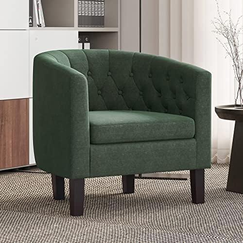 These accent chairs are dressed in a stunning olive green fabric that not only provides a vibrant pop of color to any space but is also soft to the touch. With their barrel tub design and button-tufted back, they skillfully blend classic aesthetics with modern touches, creating a captivating centerpiece for your living area or bedroom. The U-shaped curved back and padded armrests ensure that sitting for extended periods feels luxurious and supportive, making them ideal for relaxation or socializing.