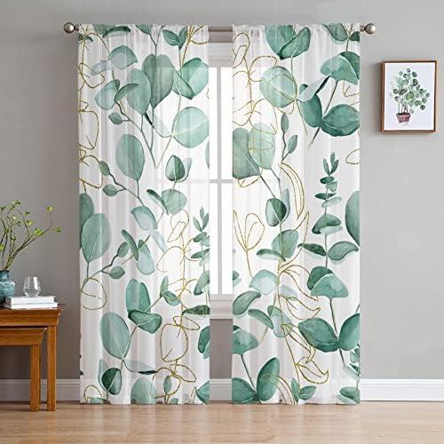 Eucalyptus Leaves Sheer Curtains⁢ 63” Length 2⁢ Panels Set,Watercolor Botanical Bedroom ⁤Curtain Drapes,Green Leaves ⁣Semi Curtain Sheers /Cafe,Rod Pocket Voile Window Treatment,52”Wx63”Lx2
