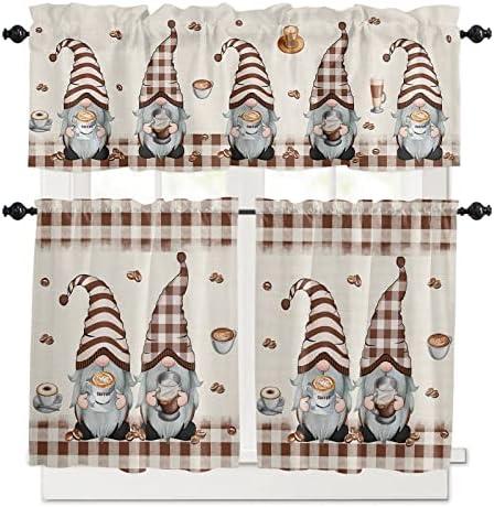 Coffee ​Gnomes Kitchen Curtains Set Short Half Curtains 36 Inches⁣ Length,⁣ Retro Brown Plaid Coffee Beans Rod Pocket⁣ Window Treatment Bedroom Tiers and Valance Set for Cafe Bathroom