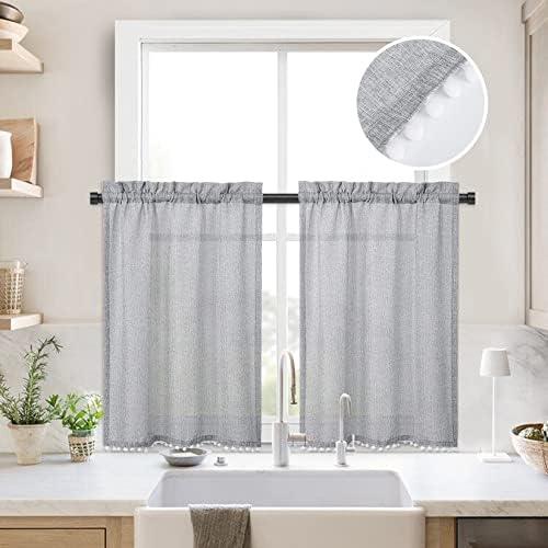 Linen Textured‌ Kitchen Curtains Half ‍Window Curtains ​Kitchen Tiers Pom Pom Decoration Short Small Window Curtains ⁣Rod⁢ Pocket Window‌ Treatments, 27 ‍x ​24 inch, Grey