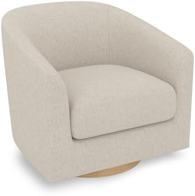 This modern and sophisticated reading chair offers a pleasing blend of style and comfort, making it an ideal accent piece for any room. Its frame is constructed from solid engineered wood and kiln-dried hardwood, ensuring durability and stability for daily use. The chair features a heavy-duty swivel wood base that allows for smooth rotation, providing ease of movement without sacrificing stability. The seat and backrest are extensively cushioned with high-density foam, topped with a soft fiber blend, creating a cozy, nest-like feel. Its compact dimensions (31.5”D x 31.3”W x 28.9”H) and contemporary barrel design make it a versatile addition to your living room, bedroom, or office.
